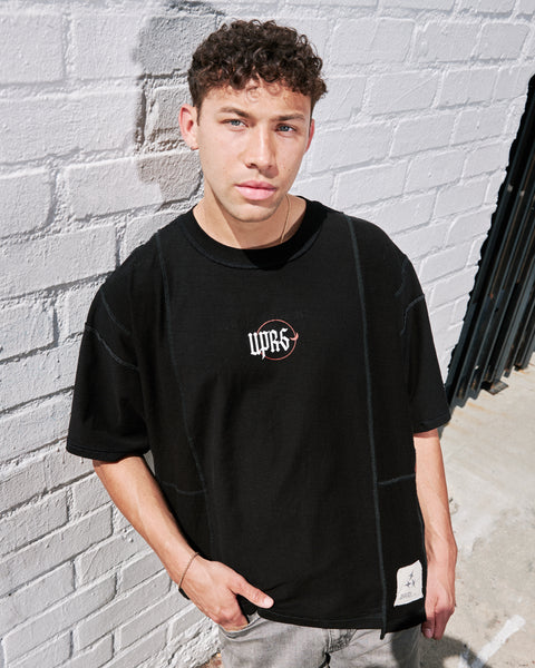 The UPRISERS x Josh Lin Capsule is a collaborative endeavor, transcending language barriers and spanning multiple time zones, to transform Josh’s illustrations into an UPRS 2.0 upcycling piece. By repurposing 3-4 discarded t-shirts, we hand-sewed each panel together to craft a one-of-a-kind t-shirt piece that seamlessly blends cultures, designs, communities, and materials.